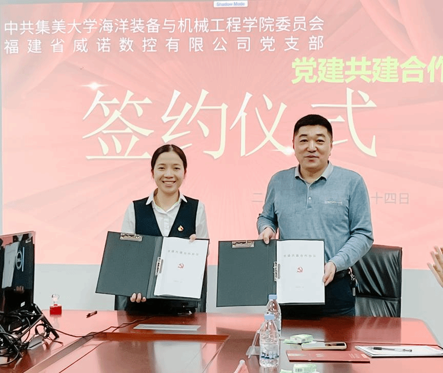 海洋装备与机械工程学院党委书记陆宝忠与福建省威诺数控有限公司党支部陈蕃敏分别代表双方签订了党建共建协议。双方约定将在思想政治、党建基础联合党建工作、党建宣传、党建工作创新等方面开展共建合作,促进党建和业务工作相互对接、相互融合、相互促进。