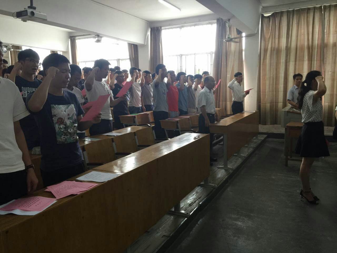 入党宣誓在雄壮的《国际歌》声中开始。75名预备党员面向党旗,举起右手在领誓人黄静老师的带领下庄严宣誓。