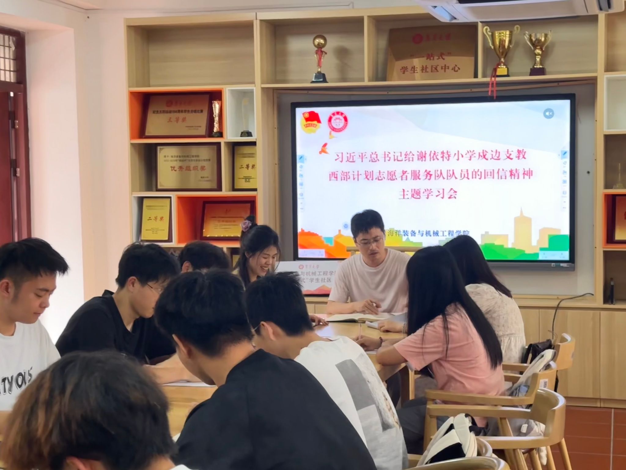 为深入学习五四青年节习近平总书记给谢依特小学戍边支教西部计划志愿者服务队队员的回信精神,5月9日,海洋装备与机械工程学院在“一站式学生社区中心”召开回信精神主题学习会。学院团委书记杨家磊、辅导员蓝雪连以及团委学生会干事参与了本次活动。