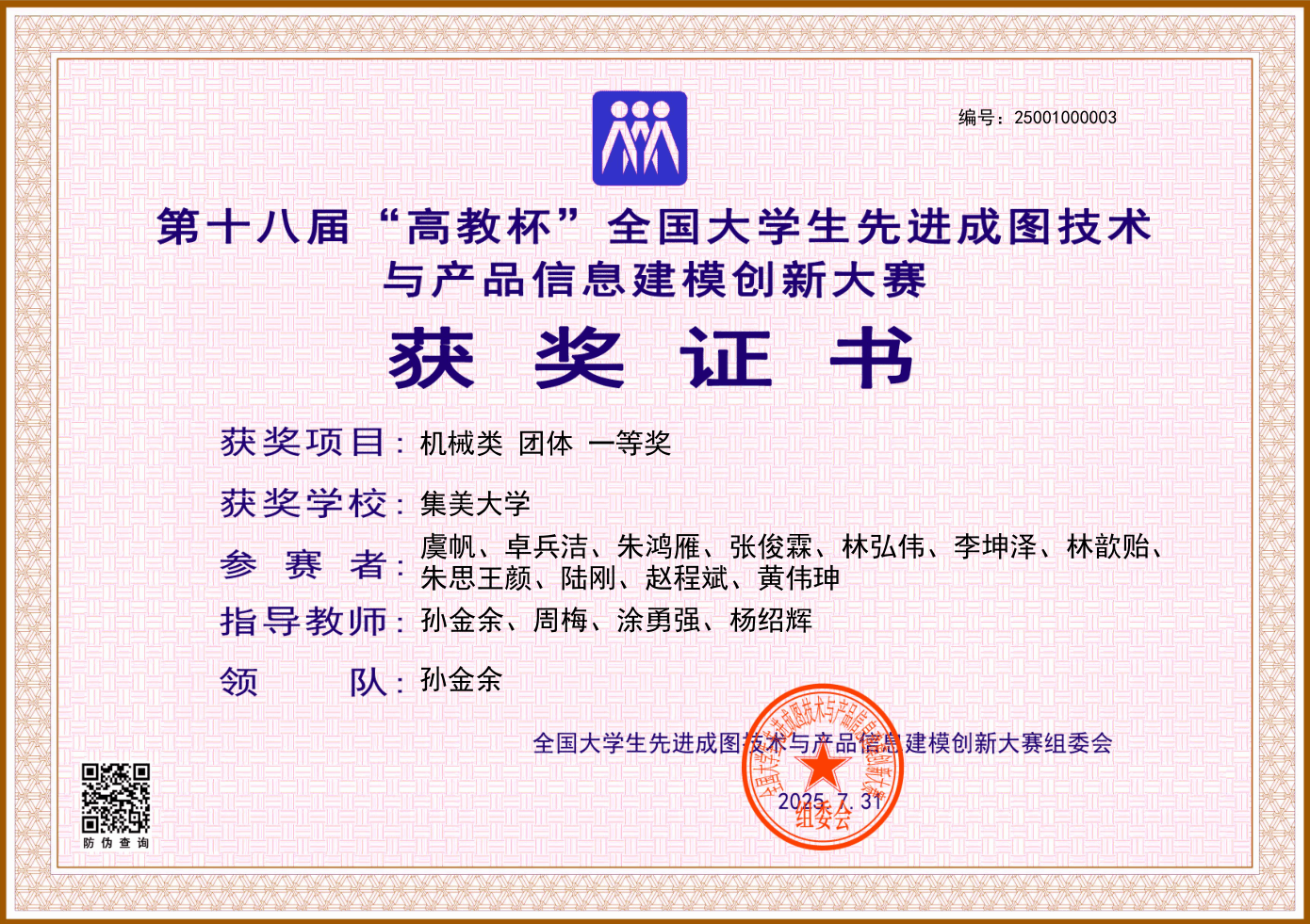 近日,第十八届“高教杯”全国大学生先进成图技术与产品信息建模创新大赛(以下简称简称“成图大赛”)在太原理工大学举办,海洋装备与机械工程学院学子在老师孙金余、周梅、涂勇强、杨绍辉的精心指导下,奋力拼搏,荣获团体一等奖(全国第三)、产品创新设计社会赛道团体一等奖(全国第一)、轻量化设计与AI应用赛道团体一等奖,为参赛以来最好成绩。