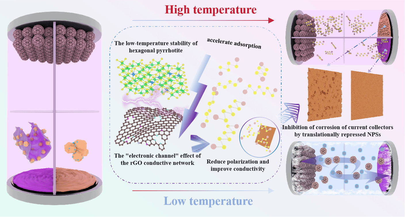 铁基硫化物因理论容量高,被视为钠离子电池(SIBs)的潜在负极材料。该研究通过一步溶剂热法结合后续退火硫化工艺,成功制备出一种新型三维复合负极材料(MFS@rGO)。该材料由Mn掺杂Fe₇S₈(MFS)嵌入N掺杂还原氧化石墨烯(rGO)构成。N掺杂rGO不仅构建了稳定的导电网络,还能与Mn掺杂协同作用,有效抑制多硫化物穿梭效应、缓解体积膨胀,大幅提升电极的结构稳定性与循环寿命。得益于多方面协同效应,MFS@rGO在- 40°C至60°C的宽温度范围内均展现出优异的电化学性能。在常温高电流密度测试条件下,即便以50 A/g的超高倍率循环10万次,容量仍能维持在206.14 mAh/g,且几乎无衰减。在全电池测试中,该材料同样表现出优异性能。该研究为通过金属原子掺杂调控晶格膨胀提供了多尺度理论支撑,也为构建可在极端温度与高电流倍率下稳定工作的钠离子电池提供了新策略。