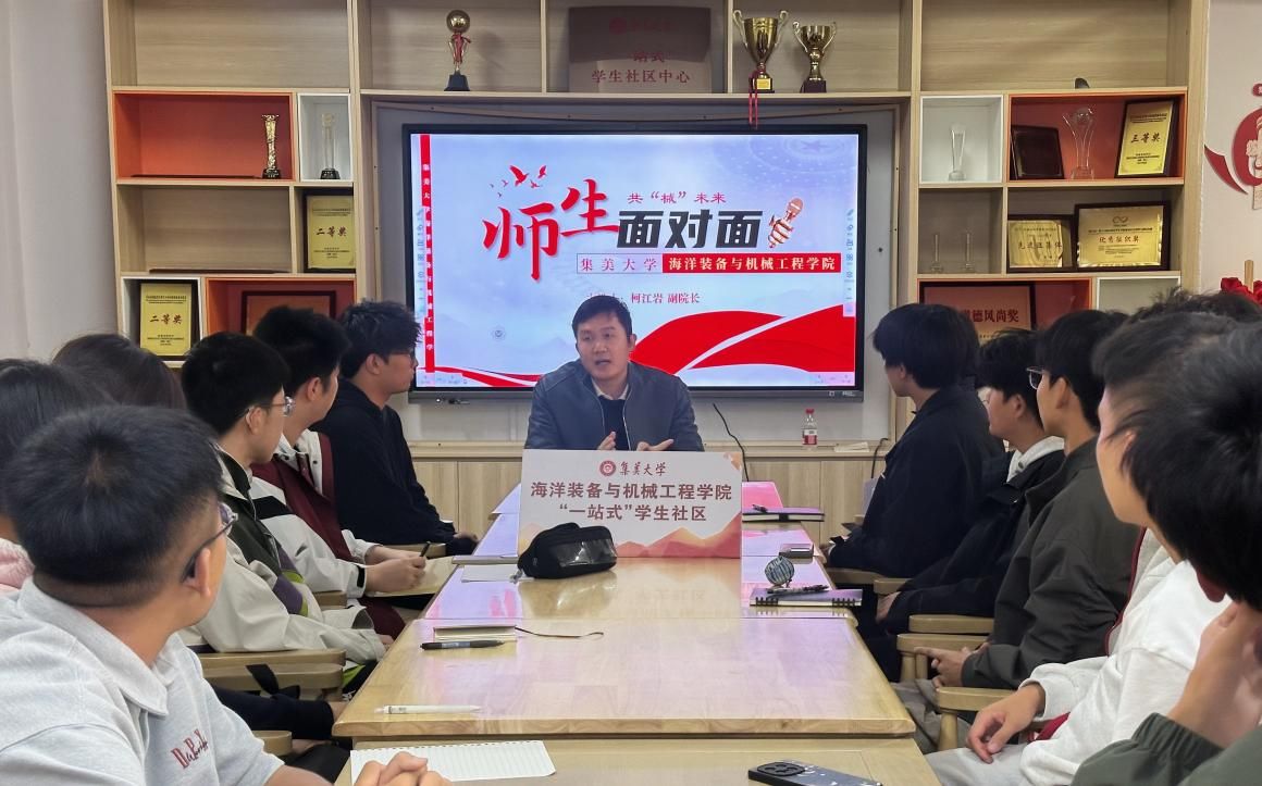 为帮助低年级学生更好适应大学生活、明确学业规划,2025年11月26日,集美大学海洋装备与机械工程学院在福东314“一站式”学生社区成功举办“共‘械’未来”师生面对面座谈会。学院柯江岩副院长担任主讲人,2025级、2024级约30名学生参与交流,2022级推免生胡登楷、2023级优秀学生周劭涵应邀分享学习经验。