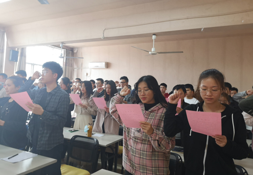 宣誓仪式在庄严的《国际歌》声中开始。在领誓人的带领下,学院预备党员面向党旗、举起右手庄严宣誓。
