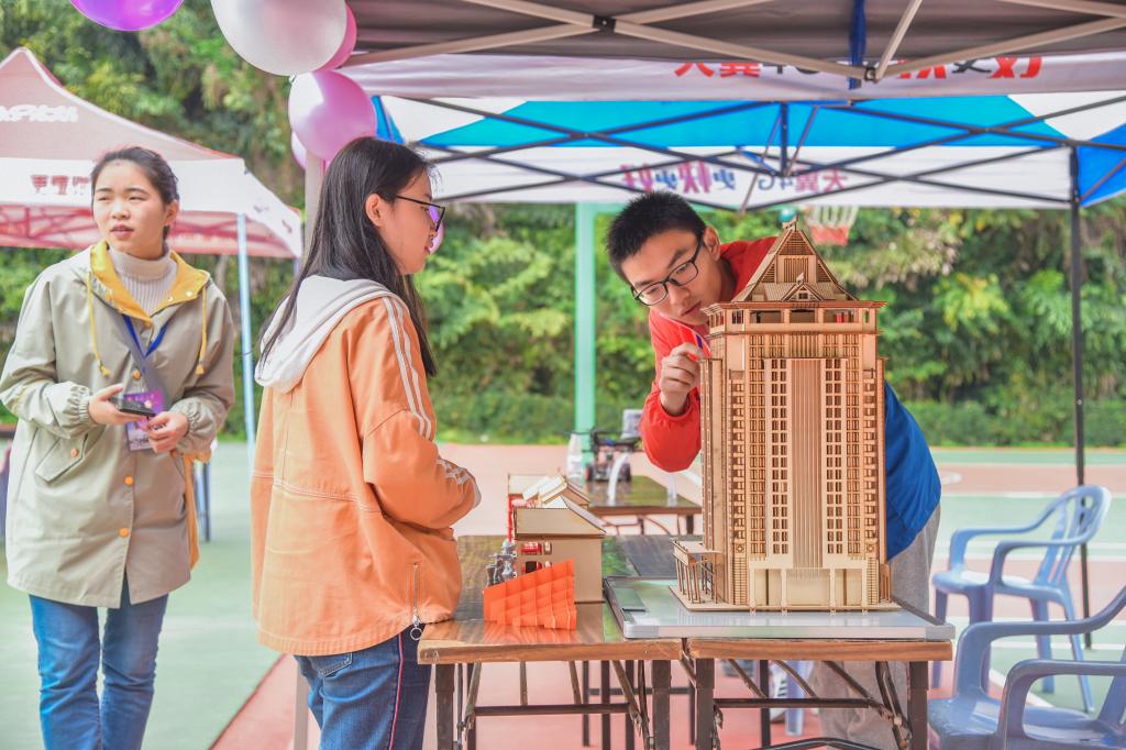 开幕式上展出了许多由学生学生科创团队制作的科技作品,方便同学们面对面参观。其中最受欢迎的是尚大楼和福东一的模型,作品是同学们利用激光切割技术切割,再由团队成员动手将每个零件拼装而成的,最大程度上还原了尚大楼和福东楼。而在场的同学最期待的是小车的模型,不管是智能车,还是红外避障小车,亦或是光寻迹小车,同学们都对此抱有极大的兴趣,并且在科创团队成员的指导下运行小车。除了以上模型,还有船模、无人机、纸雕、3D打印等科技作品,都让同学们大饱眼福。