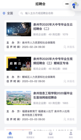 (2)方式依托福建省毕业生就业公共服务网(网址:http://220.160.52.58/,以下简称“毕业生就业公共服务网”)“云招聘”平台开展网络招聘活动。高校毕业生登录毕业生就业公共服务网注册后,即可上传简历、搜索招聘企业和职位、接受面试邀约、视频面试等,并可直接使用手机微信小程序“毕业生云面试”进行视频面试。